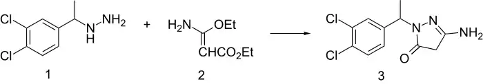 Rxn of (1-(3,4-dichlorophenyl)ethyl)hydrazine (1) with ethyl 3-amino-3-ethoxyacrylate (2) leads to a ring-forming two-site reaction and formation of the pyrazoline diuretic agent, muzolimine (3).