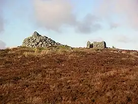 ![]() Mwdwl-eithin peak with cairn on left and trig point obscured by ruined building | |
