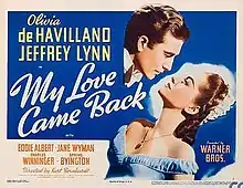 My Love Came Back is a 1940 American comedy-drama film directed by Curtis Bernhardt and starring Olivia de Havilland, Jeffrey Lynn, Eddie Albert, and Jane Wyman.[1] Based on the 1935 Austrian film Episode written and directed by Walter Reisch, the film is about a gifted young violinist who considers leaving a prestigious music academy to play in a jazz band to earn money. The academy's new president—a distinguished wealthy patron of the arts—convinces her to stay after secretly arranging a scholarship for her out of his own pocket, and the two begin attending concerts together. Complications arise when he asks his young business manager to take his place at one of the concerts. The film is notable for Heinz Eric Roemheld's musical direction and Ray Heindorf's unique swing orchestral arrangements of classical pieces. My Love Came Back was released by Warner Bros. Pictures in the United States on July 13, 1940.[2]