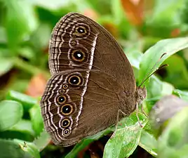 Wet-season form. Male and female. Upperside dark to somewhat pale vandyke-brown. Fore wing with a white-centred, fulvous-ringed, black ocellus in interspace 2, and rarely a very small but similar ocellus in interspace 5. Hind wing uniform, occasionally two or three postmedian obscure ocelli present. Fore and hind wings with subterminal and terminal pale lines. Underside: the groundcolour, subterminal and terminal lines on the wings as on upper-side, but crossed by a common purplish - white narrow discal fascia. Fore wing with from two to four, hind wing normally with seven ocelli, similar to, but more clearly defined than, the ocelli on the upperside ; on both wings the line of ocelli bordered inwardly and outwardly by sinuous purplish-white lines. On the hind wing only the three posterior ocelli in a straight line, the rest strongly curved outwards. In the female the median or posterior ocellus on the upperside of the fore wing is always larger than in the male.[3]