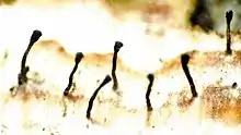 Calicioid fungi are a heterogeneous assemblage of fungi sharing the presence of a mazaedium, a structure in which loose masses of ascospores accumulate and which then are passively disseminated. Before 1970, the presence of a mazaedium was considered to be the defining trait of the order Caliciales, historically considered to be a monophyletic group.[2] Mycocaliciaceae was circumscribed in 1970 by lichenologist Alexander Schmidt. He showed that some of the genera that had been traditionally classified in the Caliciales had active spore dispersal rather than a mazaedium. He resurrected Chaenothecopsis, Mycocalicium and Strongyleuma, accepted Stenocybe and described the new genus Phaeocalicium.[3] The Mycocaliciaceae and the Sphinctrinaceae are the families in the order Mycocaliciales, which was created in 2000 by Leif Tibell and Mats Weden.[4] Mycocaliciaceae was shown in several studies to belong to the class Eurotiomycetes.[5][6][7]