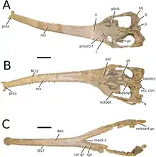 The name Mycterosuchus was coined for Steneosaurus nasutus by Andrews in 1913 in his catalogue of thalattosuchians from the Oxford Clay of southern England.[2] The genus name is derived from the Latin word for nose (mycto) and the Greek word for crocodile (soukhos), together meaning '(long) nose crocodile'.[3] Mycterosuchus nasutus was synonymized with Steneosaurus leedsi by Adams-Tresmand in 1987, but is recovered as a distinct species in the cladistic analysis of Osi et al. of 2018.[1][4]