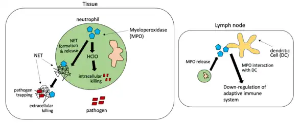 - 1 2 3 4 5 6 7 8 9 10 11 12 13 14 15 16 17 18 19 20 21 22 23 24 25 26 Odobasic D, Kitching AR, Holdsworth SR (2016). "Neutrophil-Mediated Regulation of Innate and Adaptive Immunity: The Role of Myeloperoxidase". Journal of Immunology Research. 2016: 2349817. doi:10.1155/2016/2349817. PMC 4745373. PMID 26904693.