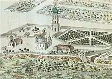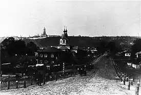 When Kiev's city limits were expanded to the left bank in 1923, the settlement became a part of the city.[3] In the 1930s, Soviet authorities closed the functioning church and monastery down, and repressed the local archimandrite. In 1935, the monastery and bellower were demolished, and a new park and street were built in its place.[6] During the 1960s to 1970s, the territory of the Mykilska Slobidka was demolished to make way for the Livoberezhnyi neighborhood;[7][8] nothing remains of the original settlement except for one pre-revolutionary building.[9]