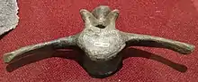 The scientific literature mostly considers the armor of ankylosauroids to have been used for defensive purposes, mainly to fend off any attacking carnivores.[36] The tails of these animals have a complex evolutionary history, with basal taxa like Mymoorapelta possessing a flexible tail with pointed osteoderms on either side and on top. The aforementioned flexibility of the tail would allow for a greater range of motion than the stiff tails of later ankylosaurids and nodosaurids.[37] It is thought that the tail could also have been used in defense against predators, though more recent findings by Arbour et al. in 2022 also consider the possibility that the tails of ankylosaurids were used for intraspecific combat and might have primarily evolved to fill a function here, which might indicate a similar use in more basal taxa like Mymoorapelta and Gargoyleosaurus.[38]