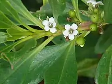 Boobialla varies in form from a prostrate shrub to a small, erect tree growing to a height of 6 m (20 ft). It has thick, smooth green leaves which are 30–90 mm (1.2–3.5 in) long and 7–22 mm (0.28–0.87 in) wide with edges that are either untoothed or toothed toward the apex. The leaves are egg-shaped and the upper and lower surfaces are the same dull green colour.[4][5][6]