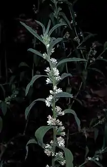 The flowers are borne in leaf axils, usually in groups of 1 to 5 on stalks 4–9 millimetres (0.2–0.4 in) long. There are 5 triangular, pointed sepals and 5 petals forming a bell-shaped tube. The petals are white or pale lilac, sometimes spotted inside the tube and on the base of the lobes. The tube is 2.5–4 millimetres (0.1–0.2 in) long and the lobes are about the same length. The tube is hairy on its inner and outer surfaces and there are 4 stamens which extend slightly beyond the petal tube. The fruit that follows flowering is an oval-shaped drupe, about 3–3.5 by 3–4.5 millimetres (0.1 in–0.1 in × 0.1 in–0.2 in).[2]