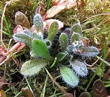 Myosotis brevis de Lange & Barkla is in the plant family Boraginaceae, was originally described as M. pygmaea var. minutiflora in 1942 by George Simpson and J.S. Thomson, and was later recognized at species rank by Peter de Lange and John Barkla, as M. brevis, in 2010.[6][7][8][9] The species required a new name since M. minutiflora Boiss. & Reut., an unrelated northern hemisphere species, was already published.[10][11] The most recent taxonomic revision continues to recognize M. brevis at the species level, and it ss morphologically most similar to the other bracteate-prostrate species endemic to New Zealand in the pygmy subgroup, i.e. Myosotis glauca and M. antarctica.[3] Myosotis brevis is the smallest New Zealand forget-me-not and differs from all other Myosotis in its small corolla (<2.0 mm diameter), short calyx (<1.7 mm at flowering), and small nutlets [0.9–1.2(–1.4) mm long by 0.5–0.8 mm wide].[3][12]