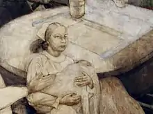 While working at Harlem Hospital, Logan met and married painter Charles Alston on April 8, 1944.[5] Alston was working on a mural project at the hospital and he featured Logan as his model for work Modern Medicine. In the oil canvas painting, Logan appears as a nurse holding a baby.[8] The project was intended to combine the fact of there being a lack of African American physicians during this time with the maternal gender role placed on women as well.[9] Alston included her alongside Dr. Louis Wright who was the first African American physician at Harlem Hospital and Louis Pasteur in this work, showcasing the advancement of Western medicine with African American and Caucasian healthcare professionals working side by side.[10]