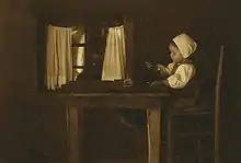 "All things considered, we consider Mrs. Wiggins' picture called Polishing Brass one of the finest in the whole room. It certainly is the most pictorial, and is exactly like a print by Chodowiecke [sic], both in subject and feeling. A woman is seated at a table with metal utensils of quaint and interesting form. The whole thing is quiet, healthy, and exceedingly well-designed – an example for hundreds."[1]