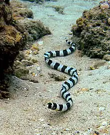 The ringed snake eel resembles the venomous sea snake, Laticauda colubrina which is a form of Batesian mimicry.[2] It also adjusts its behaviour to swim freely during the day, whereas other snake eels tend to stay hidden and roam at night.