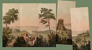 The early myrioramas were cards with people, buildings, and other images on compatible backgrounds, and could be laid out in any order, allowing a child to create a variety of imaginary landscapes. Jean-Pierre Brès, a French children's writer, published an early version which he described as a polyoptic picture (tableau polyoptique) in the early 19th century, and John Clark of London took up the idea and designed a set of cards he called a myriorama. Clark's "second series" myriorama, an "Italian landscape", was produced in 1824,[3] the same year as a similar set of English cards called a panoramacopia created by drawing teacher T.T.Dales.[4]