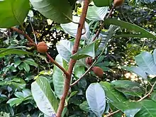 The fruits which follow are a dehiscent capsule measuring between 25 and 45 mm (1.0 and 1.8 in) long by 15–25 mm (0.6–1.0 in) wide. They are ellipsoidal in shape and covered in fine, dense mid-brown hairs. The large single seed is also ellipsoidal, dark brown in colour and surrounded by a bright-red, net-like aril.[5][8][12]