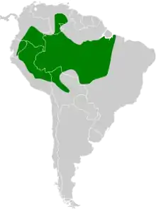 The black-faced antbird is found in a wide range of about 4,800,000 km2 across the Amazon basin in Bolivia, Brazil, Colombia, Ecuador, Peru, and Venezuela. Its natural habitat is tropical moist lowland and foothill evergreen forest, generally below 1000 m. It prefers densely vegetated areas in light gaps (such as tree falls) in terra firme forest.[5]