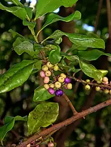 A small glabrous tree 8—15 ft. high; bark rough, blackish-brown. Leaves 1+1⁄2-2+1⁄2 in. long, elliptic-oblong or obovate-oblong, acute or obtuse, narrowed into petioles 1⁄6-1⁄4 in. long, entire, coriaceous, glandular-dotted, veins copiously reticulated, margins slightly recurved. Flowers in many-flowered fascicles on the old wood below the leaves, small, 1⁄10-1⁄8 in. diam., unisexual; pedicels short, 1⁄8-1⁄6 in. long. Calyx minute, 4-5-lobed; lobes short, broad. Corolla divided nearly to the base into 4 or 5 ovate acute lobes, which are fringed on the margins. Anthers nearly as large as the lobes. Female flowers not seen. Fruit globose, 1⁄4-1⁄3 in. diam., black when fully ripe, 1-seeded.[5]