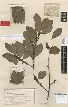 A small glabrous tree, with much of the habit and appearance of Drimys axillaris. Bark rough, blackish - brown. Leaves 2in.-2+1⁄2in. long, obovate-oblong, acute or obtuse, entire, coriaceous, gradually narrowed into short petioles 1⁄6in.-1⁄4in. long; margins slightly recurved. Flowers small, diœcious (or polygamous?) in many-flowered clusters on the old wood below the leaves. Pedicels short, rarely over 1⁄5in. Calyx minute, lobes short, broad. Corolla about 1⁄8in. long, divided nearly to the base into 5 acute lobes, which are fringed at the sides. Anthers nearly as large as the lobes. Drupe globose, 1⁄3in.-1⁄4in. diameter, black when fully ripe.[1]