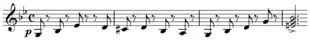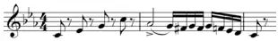 Mysterioso Pizzicato has seen "hundreds of tongue-in-cheek uses" in features and cartoons.[14] The melody appears prominently in the first Disney Silly Symphonies cartoon, The Skeleton Dance (1929) with music composed by Carl Stalling.[15] Irving Berlin used a version of it in his 1921 Music Box Revue show to accompany the entrance of a band of burglars.[5] In the 1931 Van Beuren Studios animated short Making 'Em Move it is first used to produce a 'false sense of foreboding' as a curious visitor enters the animation factory, and then again to accompany the villain in a cartoon-within-a-cartoon, and at both points the animation is Mickey Moused to synchronise the character's movements with the music.[2] The entrance is: