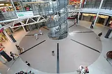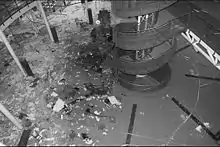 The Myyrmanni bombing took place on October 11, 2002, in Myyrmäki, Vantaa, Finland, in Greater Helsinki, at the Myyrmanni shopping mall.[1] A bomb was hidden in a backpack, which exploded in the central square of the shopping center on top of a metal waste container, located in the center of the square, at 19:36. Five people were instantly killed, including the bomber. The waste container was shattered, and fragments of the structure increased the amount of shrapnel and the devastation. The explosion ruined 400 m2 of the shopping center, carved a 10-cm deep crater in the floor where the waste container had stood and blew the glass dome over the square up and outwards from the mall. In total seven died, including two teenagers and a 7-year-old. 159 were injured, including 10 children. 66 victims required hospitalization with the remainder treated and released at the scene.[2] The bombing took place during the pre-weekend shopping surge late on a Friday afternoon, with 1,000–2,000 people in the shopping center, including many children who had come to see a clown performance.[3]