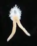 In its earliest stage, the body, oval and around 200 µm long,[lower-alpha 1] shows well-developed parapodia and a proboscis one-fourth the length of the body, but no indications of marginal cirri or caudal processes. The next stage, described from a specimen 310 µm in length, shows blunt rudiments of marginal cirri, with the last, thicker pair destined to become the caudal processes. In later stages, the body becomes round, with the marginal cirri and parapodia elongating. The caudal processes thicken before elongating past the length of the marginal cirri, while the proboscis gains the ability to retract, giving the myzostomid its adult appearance.[1]