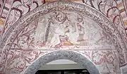 The frescos present various scenes from the Biblia pauperum, including Adam and Eve working surrounded by 14 children, the presentation of Christ in front of Pilate and other scenes from the Pilate, and Marian coronation.[1]