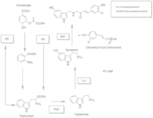 The biosynthetic pathway of N- feruloyl serotonin and N-(p-coumaroyl) serotonin has been reported.[5] In plants, the enzyme anthranilate synthase (AS) is composed of two subunits that modulate the production or suppression of tryptophan from chorismate.[6] Tryptophan is then decarboxylated by tryptophan decarboxylase (TDC) into tryptamine.[5] Tryptamine 5-hydroxylase (T5H) then hydroxylates tryptamine into serotonin.[7][8] Serotonin, the precursor to N-(p-coumaroyl) and N- feruloyl serotonin, is found in the seeds of the safflower plant.[9][10][11] Hydroxycinnamic acids are then transferred to serotonin from hydroxycinnamoyl-CoA esters by hydroxycinnamoyl-CoA: serotonin N-(hydroxycinnamoyl)transferase (SHT).[6]
