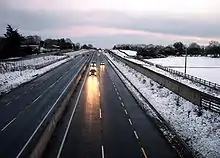 In July 2009, an upgrade of the section between the M50 junction and the Leixlip interchange was completed. In this section the road is three lanes in each direction, the median crossings were removed and the junction with the R120 is a fully grade-separated junction. Private accesses and some left turns remain which prevents the section from being designated a motorway. The speed limit is 80 km/h.[8] There are currently no signal-controlled junctions on the N/M4 between the M50 motorway and the Sligo through-pass.