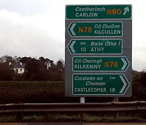 The N80 road is a national secondary road in Ireland that runs southeastwards from its junction with the N52 and R443 in the town of Tullamore in County Offaly, to the N30 at Ballynahallin, just north of Enniscorthy in County Wexford, a distance of 114.683 km. Total length is 114.683 km (71.261 mi).