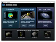 Initially released in 2010, Eyes on the Solar System was the first in the Eyes family. Eyes on the Solar System provides realistic simulated views of spacecraft, planets and other features within the Solar System with position and orientation of spacecraft and planets represented in the software are based on real data from JPL.[4] Initial releases in 2010 required users to install the Unity game engine for rendering. Since mid-2012 the application has been Java based.[5][6] Simple and advanced modes are offered.