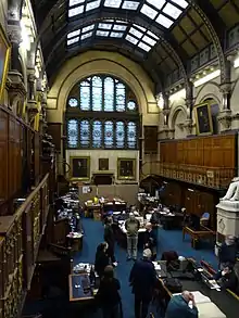 The architect was Archibald Matthias Dunn, whose father, mining engineer and Mines Inspector Matthias Dunn, had been present at the Institute's inaugural meeting. It was built at the height of the English Gothic Revival and shows a mixture of gothic and Tyneside Classical themes. The Library has high windows and a sky lit barrel-vaulted ceiling - the highest point 39 ft above the floor - with stained glass windows by Cooke of London. It includes a monumental statue of Nicholas Wood mounted on a throne in the setting of an iconstasis. There are other works of art including marble busts of John Buddle and Thomas Forster, the Institute's second president[4] and a carving of the River God Tyne including the Institute motto Moneo et munio - I advise and I protect. The original lecture theatre was replaced by the current one in 1902 designed by local architects Cackett and Burns Dick, and modelled on that at the Royal Institution in London. It features a steep rake of seating constructed from Cuban mahogany and the walls display portraits of all the Institute's Presidents since 1852.