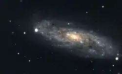 NGC 3511 features two very diffuse, thick, and patchy spiral arms that emanate from the bulge, while there are also other spiral arm fragments. Dark dust lanes can be seen across the spiral pattern. The bulge appears elliptical and is weak.[5] The galaxy is seen at a high inclination, estimated to be 70°.[6] In the centre of the galaxy lies a supermassive black hole, whose mass is estimated to be 106.46 ± 0.33 (1.3 - 6.2 million) M, based on the pitch angle of the spiral arms.[7] The galaxy had been classified as a type 1 Seyfert galaxy,[8] however it features only narrow emission lines, and has been reclassified as a HII region galaxy.[9] The Infrared Spectrograph (IRS) on the Spitzer Space Telescope has detected polycyclic aromatic hydrocarbon (PAH) emission.[10]