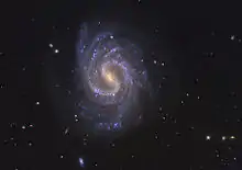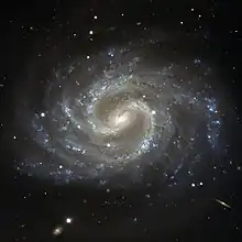 NGC 4535 is a barred spiral galaxy located some 54[3] million light years from Earth in the constellation Virgo. It is a member of the Virgo Cluster of galaxies and is located 4.3° from Messier 87. The galactic plane of NGC 4535 is inclined by an angle of 43° to the line of sight from the Earth.[4] The morphological classification of NGC 4535 in the De Vaucouleurs system is SAB(s)c,[5] which indicates a bar structure across the core (SAB), no ring (s), and loosely wound spiral arms (c). The inner part of the galaxy has two spiral arms, which branch into multiple arms further away. The small[6] nucleus is of type HII, meaning the spectrum resembles that of an H II region.[5]
