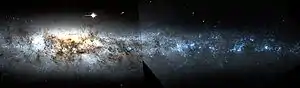 NGC 4631 contains a central starburst, which is a region of intense star formation. The strong star formation is evident in the emission from ionized hydrogen[4] and interstellar dust heated by the stars formed in the starburst.[5] The most massive stars that form in star formation regions only burn hydrogen gas through fusion for a short period of time, after which they explode as supernovae. So many supernovae have exploded in the center of NGC 4631 that they are blowing gas out of the plane of the galaxy. This superwind can be seen in X-rays[6] and in spectral line emission.[4] The gas from this superwind has produced a giant, diffuse corona of hot, X-ray emitting gas around the whole galaxy.[7]