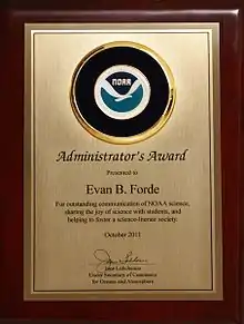 The NOAA Administrator's Award is granted to recognize recognition of significant contributions to NOAA programs. Eligible contributions must be in the areas of Equal Employment Opportunity, program management, scientific research, public service, engineering development, environmental conservation, policy development, administrative support, public affairs, and information systems.[2] Nominations for the Administrator's Award are reviewed by the NOAA Incentive Awards Board (NIAB). During the board's review of the nomination the following factors are considered:[3]