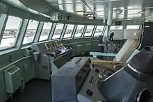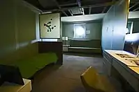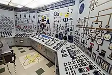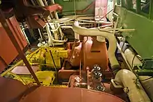 The main machinery room measures 55 feet (17 meters) long by 78 ft (24 m) wide and 32 ft (10 m) high. The main control room is immediately aft of the machinery room, from which engineers controlled both the reactor and the steam propulsion plant. A window separates the control room from the machinery room. The control room is visible from the viewing gallery on "C" Deck above. The steam plant is a relatively standard steam plant in its general characteristics, with a nine-stage high-pressure turbine and a 7-stage low-pressure turbine driving a single propeller shaft. The steam and water chemistry program was set up and managed by the Bull & Roberts Company to match the systems it provided for US Navy nuclear-powered aircraft carriers and submarines.[11] The turbines were specially adapted to use the saturated steam typically provided by a nuclear power source. It was also unusual in having a 750-horsepower (560-kilowatt) electric motor geared to the high-pressure turbine for use in an emergency. The motor was driven by either the ship's steam turbogenerators or the 750 kW emergency diesel generators located in the rear of the pilothouse. These generators could provide basic propulsion to the motor while running the reactor coolant pumps. The motor was upgraded to provide greater torque and reversibility to allow it to move the ship away from a pier in the event of a reactor accident.[10]
