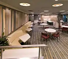 The topmost deck of the superstructure comprises the pilothouse, radio room, chart room, a battery room and an emergency diesel generator. The next lower deck comprises the officers' accommodations, with an officers' lounge at the tapering rear portion of the superstructure. Below this level is the promenade deck comprising, from forward aft, the elliptical main lounge, the main stair and elevator, and the Veranda Lounge. The bar was provided with enclosed walkways outboard, and a glass wall overlooking the swimming pool and promenade deck aft. A dance floor was provided in the center of the lounge, surrounded by tables with illuminated glass tops. The back bar features a glass and metal sculptural interpretation of the periodic table of the elements.[10]