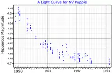 NV Puppis (NV Pup), also known as υ1 Puppis, is a class B2V[3] (blue main-sequence) star in the constellation Puppis. Its apparent magnitude is 4.67[2] and it is approximately 800 light years away based on parallax.[1]