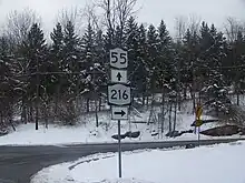 NY 52 and NY 216 largely swapped alignments in Spring 1937 as part of a larger realignment of NY 52 through Dutchess and Putnam counties. Route 52 was relocated onto NY 216 between Stormville and Ludingtonville, from where it followed a new roadway south to Lake Carmel. The former alignment of NY 52 between Stormville and Towners became NY 216, which was also extended eastward along NY 164 to a new eastern terminus at NY 22 east of Towners.[7][8][9] The alignment of NY 216 remained unaltered until January 1, 1970, when Route 216 was truncated to its current eastern terminus in Poughquag. As part of the truncation, NY 216's former alignment from West Pawling to Patterson was renumbered to NY 292 while the east–west roadway through Towners became NY 164.[10]