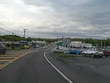 The highway continues east into Hunter, one of only a handful of communities along NY 23A, becoming the village's main street.[4] Here, the ski trails striping the Colonel's Chair, a corner of Hunter Mountain that hosts the eponymous ski area, come into view.[7] Traffic, usually low here,[1] becomes heavy on weekends during ski season as commuters from outside the region head to the adjacent resort.[4] Once past the village, the fire tower on Hunter Mountain's 4,040-foot (1,231 m) summit becomes visible to the south as the highway continues to climb in elevation. Roughly 1 mile (1.6 km) from the village limits, NY 23A connects to NY 214 at the north end of Stony Clove Notch, a narrow cleft separating Hunter Mountain from neighboring Plateau Mountain.[7]