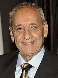 Nabih Berri (Arabic: نبيه مصطفى برّي, romanized: Nabīh Muṣṭafā Barriyy; born 28 January 1938) is a Lebanese politician who has been serving as Speaker of the Parliament of Lebanon since 1992. He heads the Amal Movement.[1][2][3]