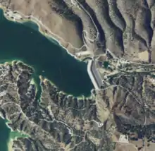 Nacimiento Dam is an earthfill dam with a height of 210 feet (64 m) and a crest length of 1,630 feet (500 m). Altogether, the dam contains 3,270,000 cubic yards (2,500,000 m3) of material.[2] The crest of the dam is 825 feet (251 m) above sea level, and the spillway crest elevation is 787.75 feet (240.11 m). The concrete spillway is located on the north side of the dam and is controlled by an inflatable Obermeyer gate. The dam also has two outlet works, a low level valve for normal water releases with a design capacity of 460 cubic feet per second (13 m3/s), and a high level valve for flood control with a capacity of 5,500 cubic feet per second (160 m3/s).[3] There is also a small hydroelectric plant at the dam with a capacity of 4,000 kilowatts.[3]