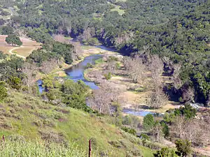 The Nacimiento River (Spanish: Río Nacimiento) is a 64.8-mile-long (104.3 km)[3] river in southern Monterey County and northern San Luis Obispo County, California. A large portion of the river's run is on military reservations. The river's upper reaches are inside Fort Hunter Liggett, Lake Nacimiento is in the middle and the lower reaches are inside Camp Roberts. It is the largest tributary of the Salinas River in terms of streamflow.[4]