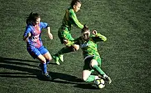 Nagihan Avanaş (left) for Ataşehir Belediyespor challenging an attack of Gazikentspor in the 2014–15 League season's home match.