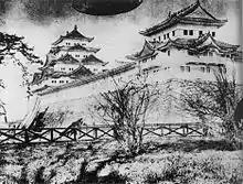 During the Pacific War the castle was used as the Tokai district army headquarters and the administration office of the Nagoya POW camp.[4] The aerial bombardments of Nagoya by the United States Army Air Forces as part of the air raids on Japan brought the most destruction to the castle in its entire history. In January 1945 (Shōwa 20), the Sarumen Tea House was destroyed in air raids. On May 14, the main keep, small keep, golden shachi, Honmaru Palace, northeast turret, and other buildings were completely destroyed in air raids. In June of that year, some of the paintings saved from Honmaru Palace were moved for safekeeping to the Haiho Shrine, Toyota-shi. They returned in May 1946 (Shōwa 21).