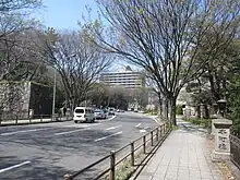 Located behind the Kaya tree is the former site of the warehouses and rice granaries (米倉 komegura). These were six long-shaped buildings running parallel to the Cormorant's Neck moat. After the Pacific War the Nishinomaru Exhibit Hall was located here and was replaced with two buildings that were rebuilt in the appearance of the former warehouses to house the new exhibition space. The new Nishinomaru Okura Museum (西の丸御蔵城宝館 Nishinomaru Okura Jōhōkan[17] Nishinomaru Warehouses Castle Treasure Hall) is located where the third and fourth warehouses were and was opened on November 1, 2021 and exhibits important cultural properties such as the fusuma paintings of the Honmaru Palace.[18][19][20][21][22][23] It also showcases the history and persons of the castle.[24] Further excavations will be carried out in the future to reveal and clarify the original layout of the storehouses.[18]