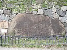 Located at the east gate is a very large stone built into the wall. According to legend, Katō Kiyomasa, a renowned general and castle engineer, hauled this large stone that was later named after him to the castle.[15] But it is probable that this part of the castle's foundation was constructed by Kuroda Nagamasa. Feudal lords who were ordered to build the stone walls carved their marks on their stones to distinguish them from the stones of other lords.