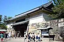 The Nishinomaru Enokida Gate (西之丸 榎多門 Nishinomaru enokidamon) is used today as the main entrance (正門 seimon) to the castle. The original structure was built as a tower gate (yagura mon). A smaller front gate to the south was called Kabuki Gate (冠木門 Kabukimon) and a rectangular-shaped barbican tower was built on top of the surrounding stone walls. Together the structures formed a square called Masugata Koguchi (桝形虎口) where the enemy could be encircled. The gate formed an important part of the castle's defenses, being the main portal into the western Nishinomaru (西之丸) enceinte.