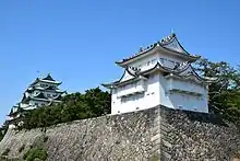 Called the Tatsumi turret, the southeast turret (東南隅櫓 Tōnan-sumi Yagura[30]) looks like it has two stories, but it actually has three. The white coating on the mud walls made the structure both waterproof and fireproof. The southeast turret is similar to the southwest turret. The construction adheres to the original Tokugawa design. The symbol of a hollyhock, the crest of the Tokugawa clan, can be seen on the ridge-end tiles. The turret has been designated an Important Cultural Asset.[15]