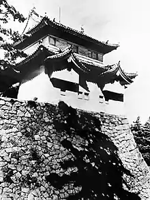 The small and main keep both burned down during the Pacific War, and were reconstructed in 1959 with the use of modern materials such as steel beams and concrete.[15] In 2017 the city announced the donation drive to completely reconstruct the keeps again in wood based on the original plans and surveys done before the war. The aim is to complete the main tower by 2022.[9][10][11] The webpage for online donations was opened in 2020.[32]