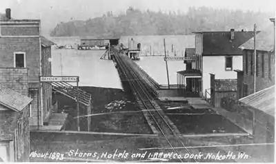 Nahcotta was first settled in 1890 by J.A. Morehead and named for Nahcati, the chief of a local Chinook tribe.[1][2] Nahcotta was once the northern terminal of the Ilwaco Railway and Navigation Company, a narrow gauge railroad which ran from Ilwaco, and later from Megler, in southwestern Pacific County, up the Long Beach Peninsula to Nahcotta and back, once a day. The railroad was in operation from 1889 to 1930.[2]