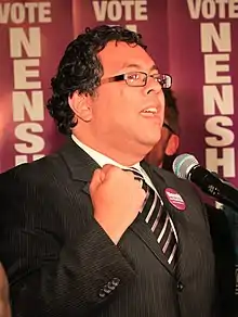 Naheed Kurban Nenshi (born February 2, 1972) is a Canadian politician who was the 36th mayor of Calgary, Alberta. He was elected in the 2010 municipal election with 39% of the vote, and is the first Muslim mayor of a large North American city. He was re-elected in 2013 with 74% of the vote and again re-elected in 2017 to a third term with 51% of the vote. After serving three terms as mayor, he did not seek re-election in the 2021 Calgary municipal election, and was succeeded by Jyoti Gondek.[2]